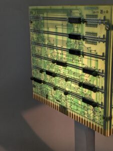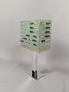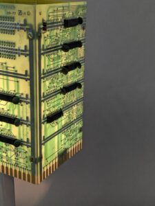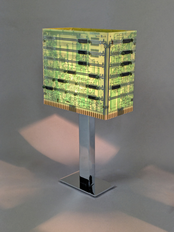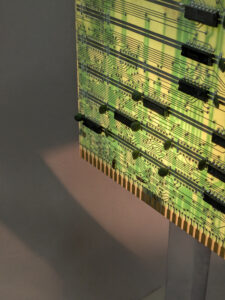 Sous l’effet de la lumière, le graphisme des anciennes cartes électroniques qui la composent transparaît, pour laisser place à notre imaginaire. Surgissent alors des façades de building, des vues aériennes de cités mégapoles, des partitions de musique, … Dans la journée, à la lumière du jour, elle reprend ses couleurs et son aspect brut. Réapparaissent, alors, les volumes et les couleurs de ses composants.