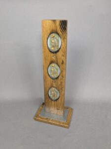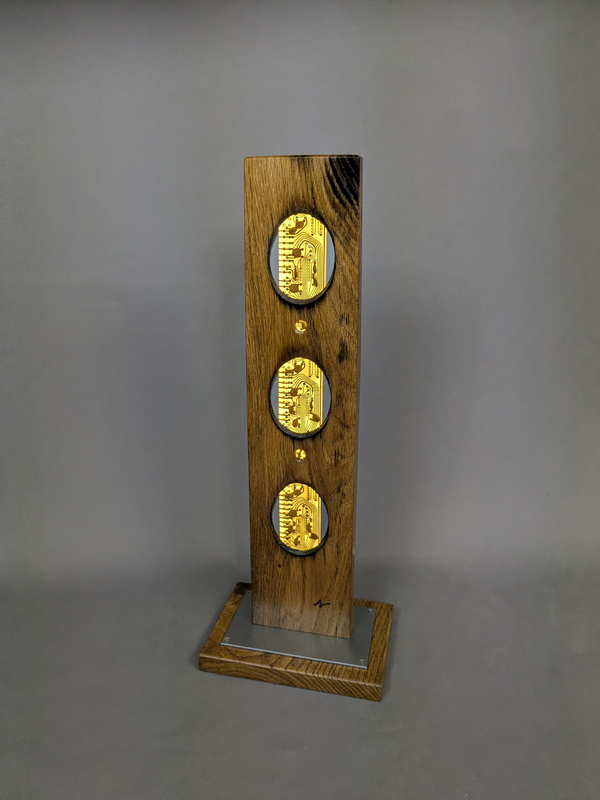 Matières : structure en chêne traité à l’huile cire naturelle, acier brossé verni, anciennes cartes électroniques.