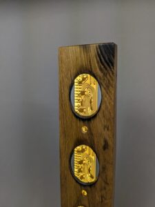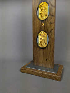 Elle a été conçue comme une sculpture lumineuse source d’un éclairage d’ambiance, tel un vitrail contemporain. Sans son cordon électrique amovible, elle devient une sculpture autonome qui associe la chaleur du bois et le graphisme des anciens circuits imprimés.